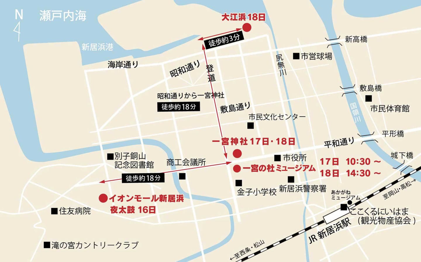 Schedule 2025年 新居浜太鼓祭り川西地区 見どころ地図 10月16日.17日.18日 3日間の川西地区の見所を地図にしました。 川西地区 運行コース 〉 主なスケジュール (2025年度) 10月16日 お祭り集会地区内運行イオンモール夜太鼓 10月17日 一宮の杜ミュージアム一宮神社宮出し 10月18日 大江浜かきくらべ口屋入り一宮の杜ミュージアム一宮神社宮入り 10月16日 お祭り集会地区内運行イオンモール夜太鼓 10月17日 一宮の杜ミュージアム一宮神社宮出し 10月18日 大江浜かきくらべ口屋入り一宮の杜ミュージアム一宮神社宮入り 口屋太鼓台の見どころ 新居浜市立宮西小学校 MAP 昭和通り MAP イオンモール新居浜 MAP 大江ふれあい広場 MAP 海岸通り MAP 登り道サンロード MAP 一宮神社南参道 観覧席あり 一宮の杜ミュージアムHP MAP 一宮神社 MAP 協力・協賛 (順不同) 住友金属鉱山 株式会社 様 別子銅山記念館 様 一般財団法人 新居浜市観光物産協会 様 口屋跡記念公民館 様 有限会社 日繍 様 有限会社 鍛示商店 様 サイトマップ 協力・協賛 (順不同) ・住友金属鉱山 株式会社 様・別子銅山記念館 様・一般財団法人 新居浜市観光物産協会 様 ・口屋跡記念公民館 様・有限会社 日繍 様・有限会社 鍛示商店 様 サイトマップ